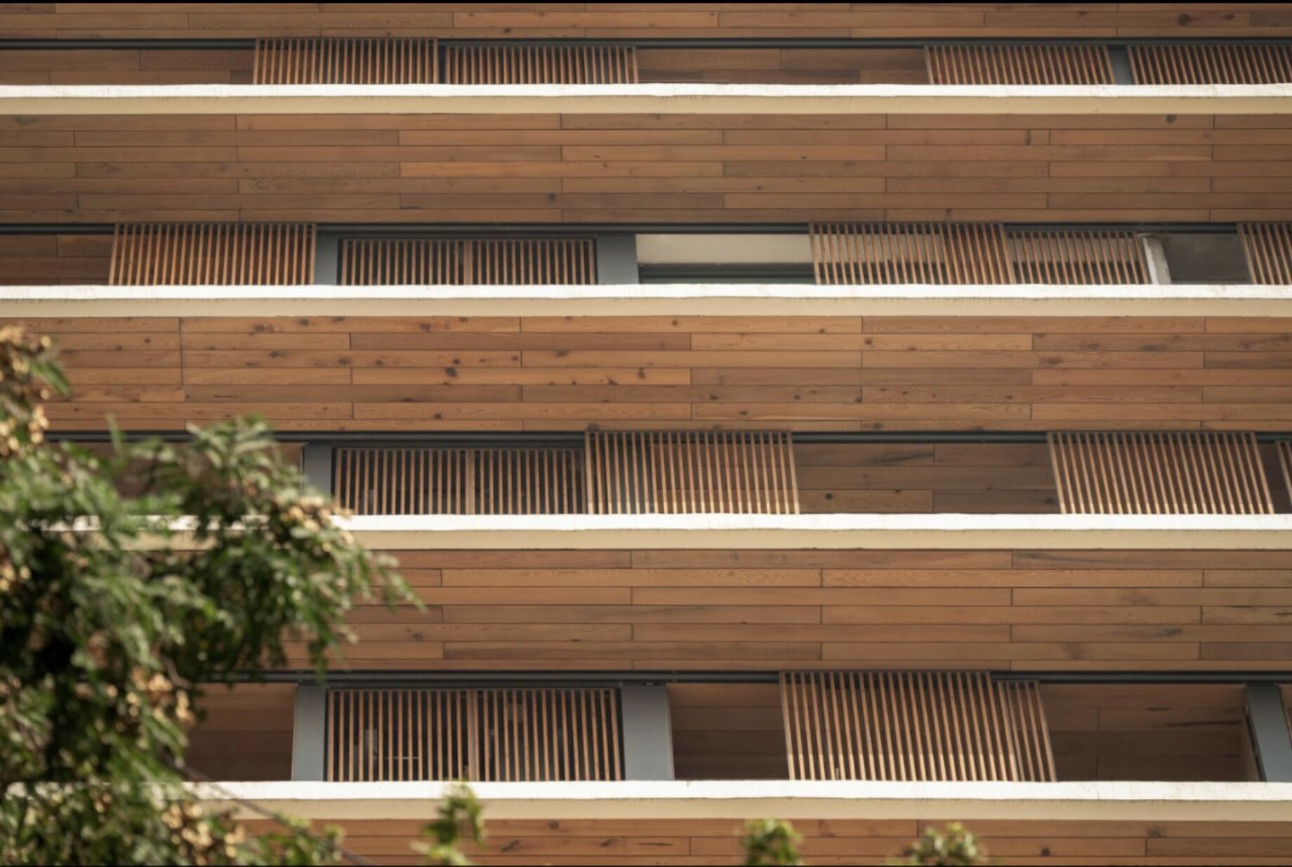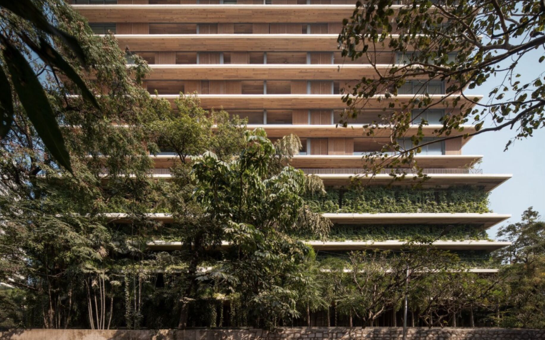 Clad in high-performance, fully operable glazing, with deep chajjas that shield each unit from the sun and monsoon rain, the greenery cascades down the chajjas, lending additional shading and detail to the building’s silhouette.