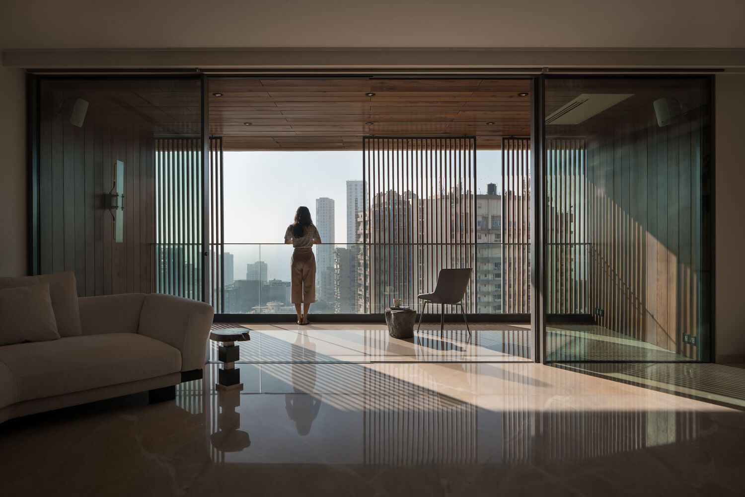 The 21-floor, 70-meter-tall tower’s facade features slimline windows, shading screens, and integrated railings. Oriented towards the west, it maximizes ocean views and breezes while mitigating heat gain with high-performance glazing, deep projection shades, and operable aluminum sunscreens in a wooden finish.
